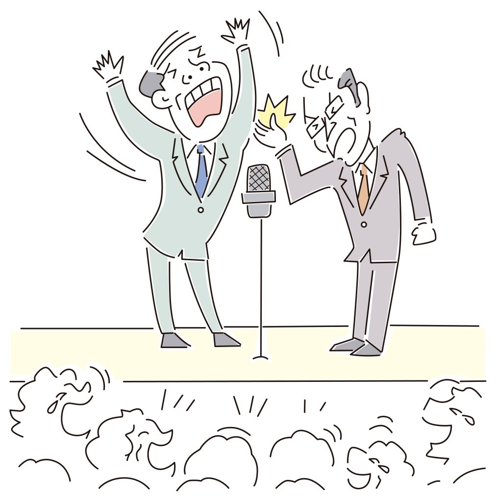今でもアメリカのコメディ番組を楽しみながら、日本のお笑いも消費しています。エキスパートではないですが、せっかくなので、両方比べてみましょう。日本の漫才の原点は江戸時代の寄席からだそうです。前の落語家が後の落語家にバトンタッチするとき、演者二人で世間話してて笑いを取る。ですから漫才は必ず2人以上はわかりますね。
